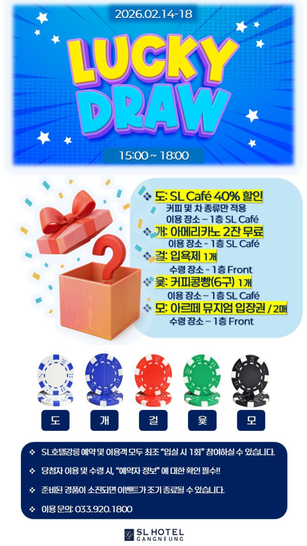 ※ 당첨 고객 대상 프런트 및 SL Cafe 직접 수령 또는 이용 시, 예약자 정보 및 당첨 내역 확인 필수!! 입니다.